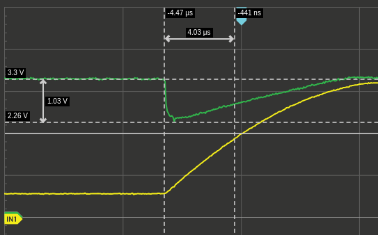 Voltage drop when switching on RFM12 over transistor with 10µF cpacitor (green: VCC before transistor, yellow: VCC at RFM12)