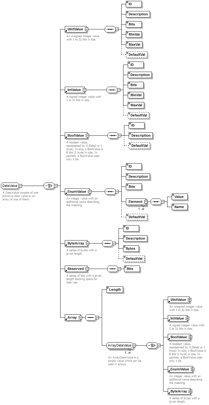 Several primitive data types are defined and can be used for the e2p layout definition as well as the packet layout. The UIntValue is an unsigned integer within a given range using a defined amount of bits. The IntValue is a signed integer. The BoolValue can be true or false and is one bit in size in packets. EnumValue is used for settings represended as integer values in the firmware, but have an additional name describing the meaning of the value. The ByteArray consists of a specific amount of bytes. The Reserved element is used to block a number of bits which are not used currently.