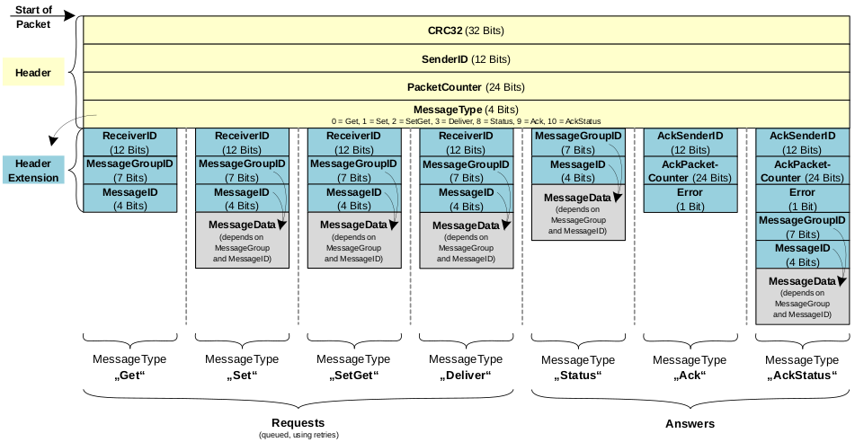 - AckSenderID and AckPacketCounter are the reference to the request that is acknowledged ("Ack", "AckStatus").