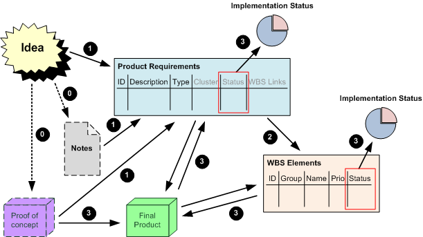 - An implementation status which tells how far the development is done. I recommend at least to distinguish between "open", "implemented" and "verified".