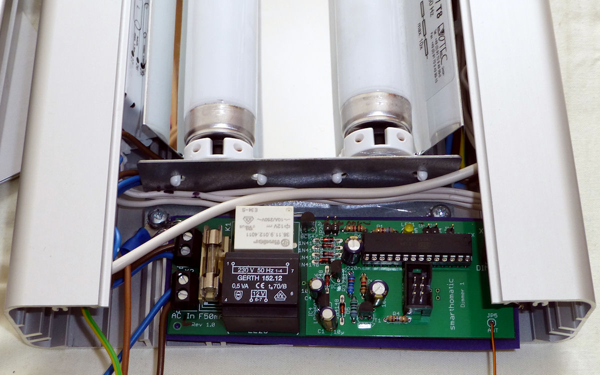 In conjunction with a high frequency electronic power supply (like the OSRAM Quicktronic Deluxe HF Dim T8) and daylight CFL tubes, you get a very nice bright non-flickering light (~50 kHz switching) which you can control remotely. This SHC device is small enough to be directly integrated into a fluorescent lamp housing.