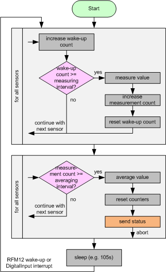 In general the device wakes up by the RFM12 timer to read out its sensors. The frequency of measuring can be configured very detailed by setting the following values in e2p: